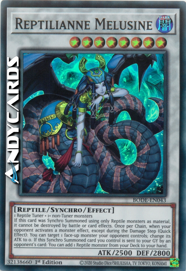 If this card was Synchro Summoned using only Reptile monsters as material, it cannot be destroyed by battle or card effects. Once per Chain, when your opponent activates a monster effect, except during the Damage Step (Quick Effect): You can target 1 face-up monster your opponent controls; change its ATK to 0. If this Synchro Summoned card you control is sent to your GY by an opponent's card: You can add 1 Reptile monster from your Deck to your hand.
