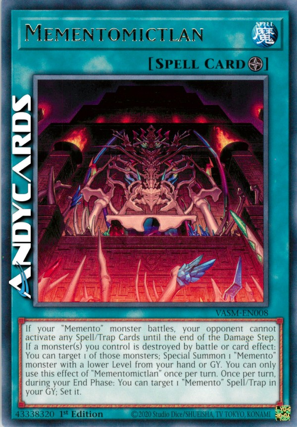 If your "Memento" monster battles, your opponent cannot activate any Spell/Trap Cards until the end of the Damage Step. If a monster(s) you control is destroyed by battle or card effect: You can target 1 of those monsters; Special Summon 1 "Memento" monster with a lower Level from your hand or GY. You can only use this effect of "Mementomictlan" once per turn. Once per turn, during your End Phase: You can target 1 "Memento" Spell/Trap in your GY; Set it.