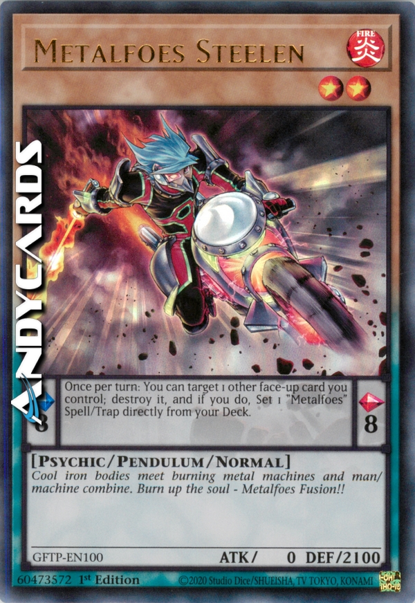 Cool iron bodies meet burning metal machines and man/machine combine. Burn up the soul - Metalfoes Fusion!! - Pendulum Effect: Once per turn: You can target 1 other face-up card you control; destroy it, and if you do, Set 1 "Metalfoes" Spell/Trap Card directly from your Deck.