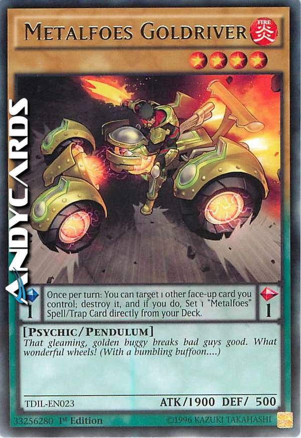 That gleaming, golden buggy breaks bad guys good. What wonderful wheels! (With a bumbling buffoon....) Pendulum Effect: Once per turn: You can target 1 other face-up card you control; destroy it, and if you do, Set 1 "Metalfoes" Spell/Trap Card directly from your Deck.