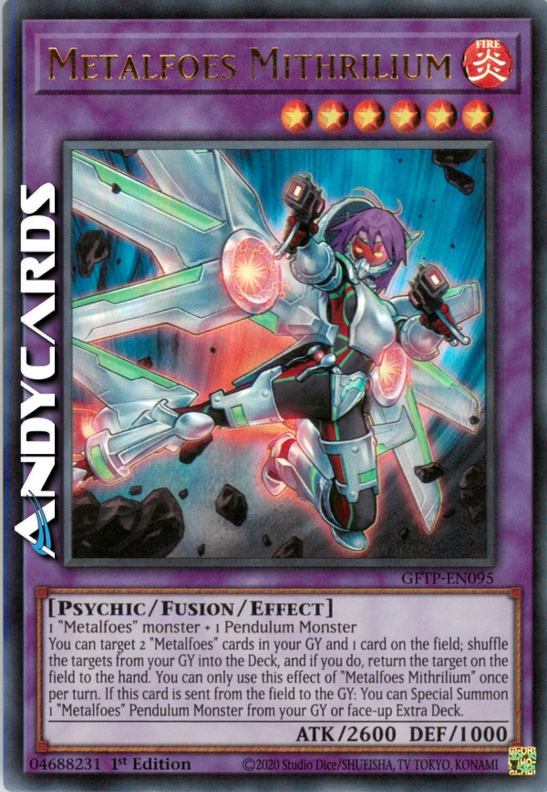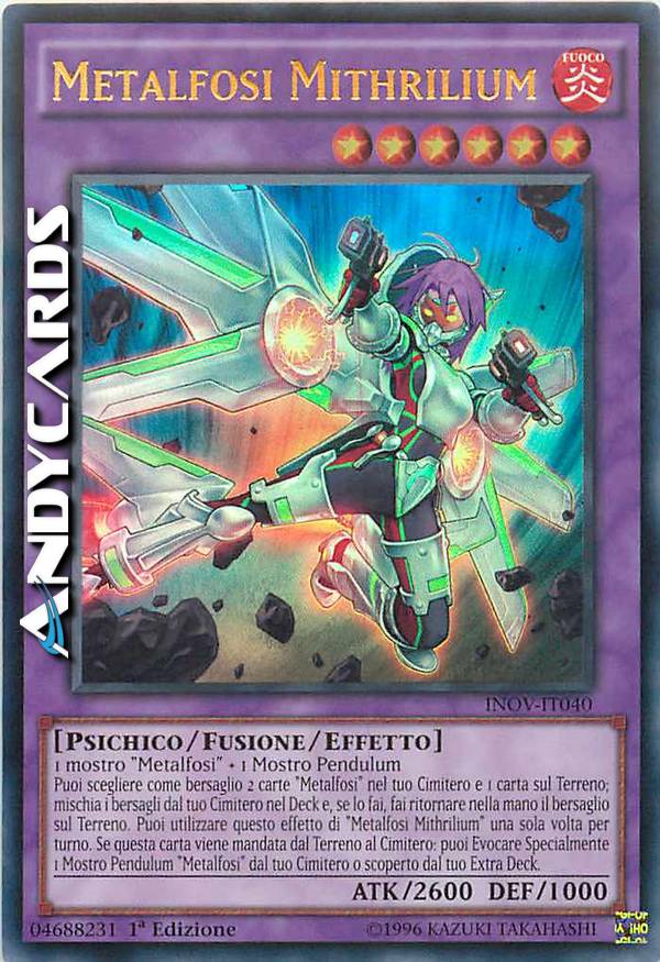 1 mostro "Metalfosi" + 1 Mostro Pendulum - Puoi scegliere come bersaglio 2 carte "Metalfosi" nel tuo Cimitero e 1 carta sul Terreno; mischia i bersagli dal tuo Cimitero nel Deck e, se lo fai, fai ritornare nella mano il bersaglio sul Terreno. Puoi utilizzare questo effetto di "Metalfosi Mithrilium" una sola volta per turno. Se questa carta viene mandata dal Terreno al Cimitero: puoi Evocare Specialmente 1 Mostro Pendulum "Metalfosi" dal tuo Cimitero o scoperto dal tuo Extra Deck.