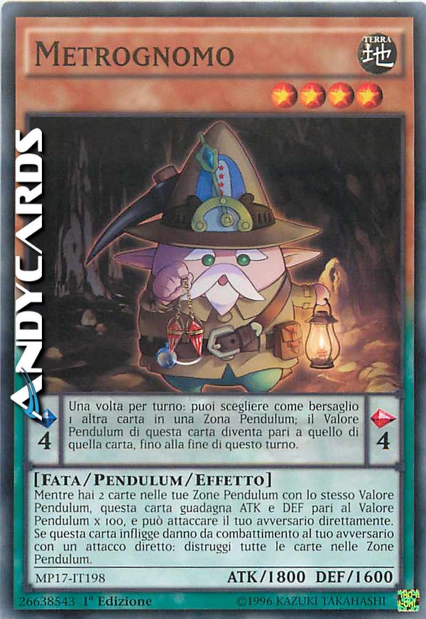 Valore Pendulum 4 Una volta per turno: puoi scegliere come bersaglio 1 altra carta in una Zona Pendulum; il Valore Pendulum di questa carta diventa pari a quello di quella carta, fino alla fine di questo turno. - Mentre hai 2 carte nelle tue Zone Pendulum con lo stesso Valore Pendulum, questa carta guadagna ATK e DEF pari al Valore Pendulum x 100, e può attaccare il tuo avversario direttamente. Se questa carta infligge danno da combattimento al tuo avversario con un attacco diretto: distruggi tutte le carte nelle Zone Pendulum.