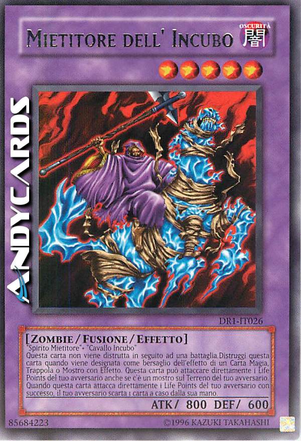 Spirito Mietitore + "Cavallo Incubo". Questa carta non viene distrutta in seguito ad una battaglia. Distruggi questa carta quando viene designata come bersaglio di una Carta Magia, Trappola o Mostro con Effetto. Questa carta può attaccare direttamente i Life Points del tuo avversario anche se c'è un mostro sul Terreno del tuo avversario. Quando questa carta attacca direttamente i Life Points del tuo avversario con successo, il tuo avversario scarta 1 carta a caso dalla sua mano.