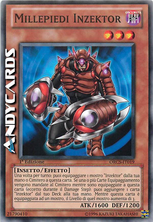 Una volta per turno: puoi equipaggiare 1 mostro "Inzektor" dalla tua mano o Cimitero a questa carta. Se una o più Carte Equipaggiamento vengono mandate al tuo Cimitero mentre sono equipaggiate a questa carta (eccetto durante il Damage Step): puoi aggiungere 1 carta "Inzektor" dal tuo Deck alla tua mano. Mentre questa carta è equipaggiata a un mostro, il Livello di quel mostro aumenta di 3.