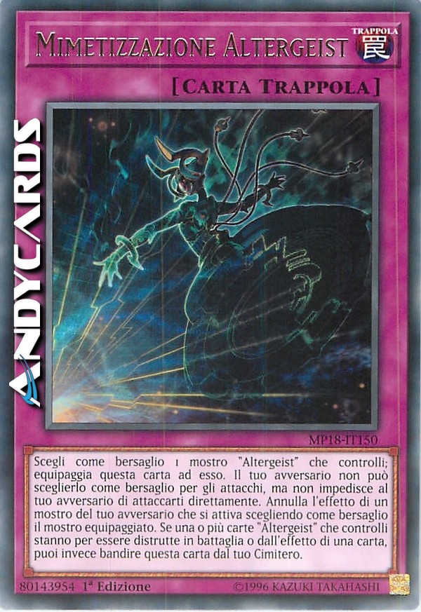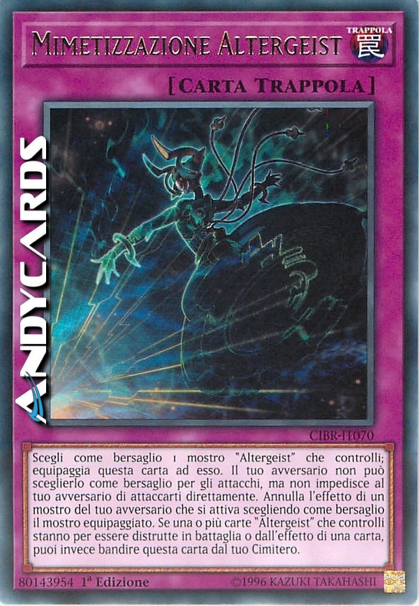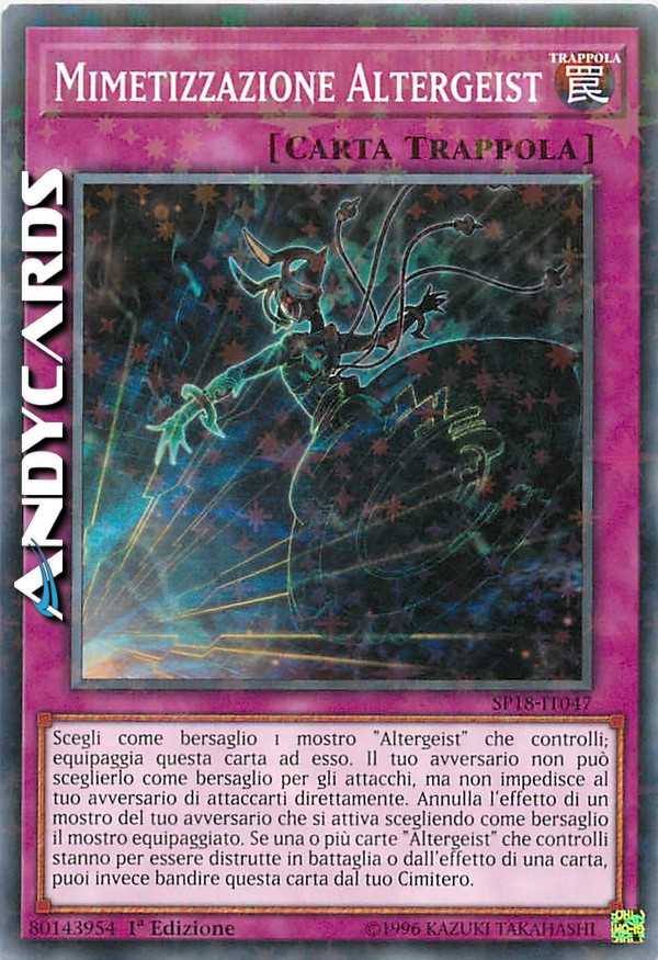 Scegli come bersaglio 1 mostro "Altergeist" che controlli; equipaggia questa carta ad esso. Il tuo avversario non può sceglierlo come bersaglio per gli attacchi, ma non impedisce al tuo avversario di attaccarti direttamente. Annulla l'effetto di un mostro del tuo avversario che si attiva scegliendo come bersaglio il mostro equipaggiato. Se una o più carte "Altergeist" che controlli stanno per essere distrutte in battaglia o dall'effetto di una carta, puoi invece bandire questa carta dal tuo Cimitero.