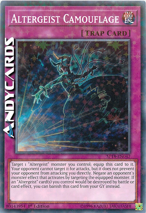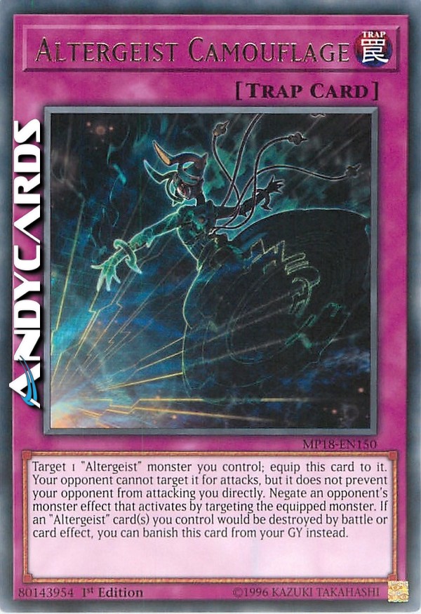 Target 1 "Altergeist" monster you control; equip this card to it. Your opponent cannot target it for attacks, but it does not prevent your opponent from attacking you directly. Negate an opponent's monster effect that activates by targeting the equipped monster. If an "Altergeist" card(s) you control would be destroyed by battle or card effect, you can banish this card from your GY instead.