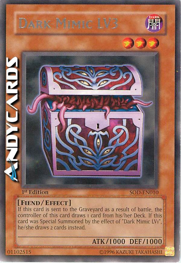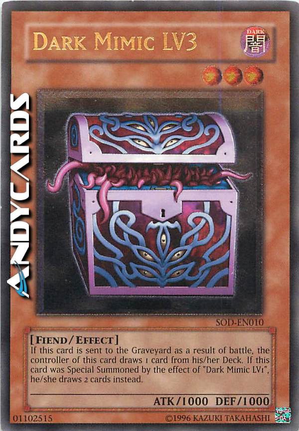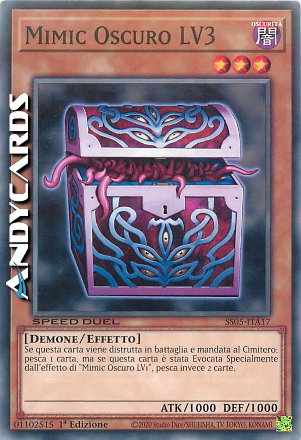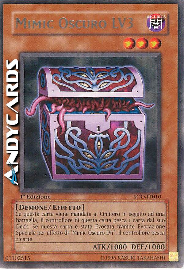 Se questa carta viene distrutta in battaglia e mandata al Cimitero: pesca 1 carta, ma se questa carta è stata Evocata Specialmente dall'effetto di "Mimic Oscuro LV1", pesca invece 2 carte.