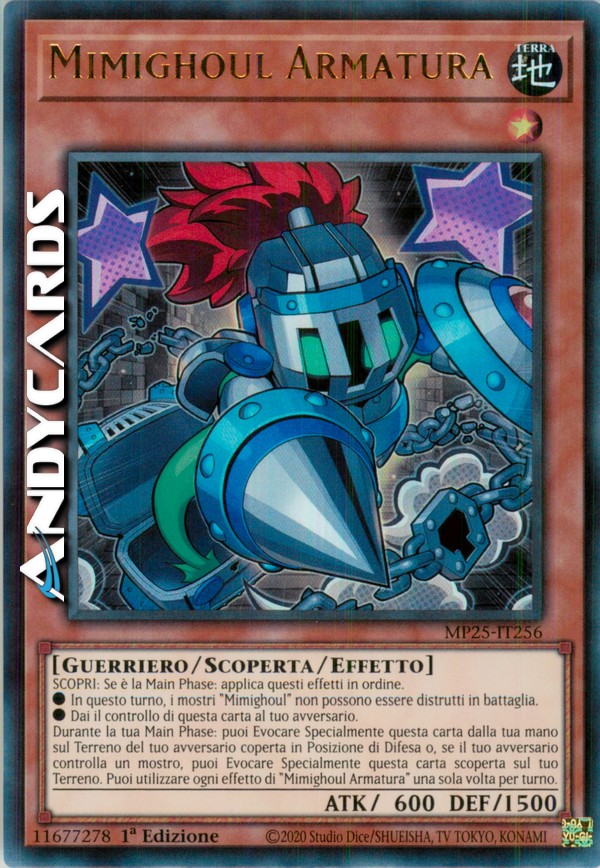 Durante la tua Main Phase: puoi Evocare Specialmente questa carta dalla tua mano sul Terreno del tuo avversario coperta in Posizione di Difesa o, se il tuo avversario controlla un mostro, puoi Evocare Specialmente questa carta scoperta sul tuo Terreno. Puoi utilizzare ogni effetto di "Mimighoul Armatura" una sola volta per turno.