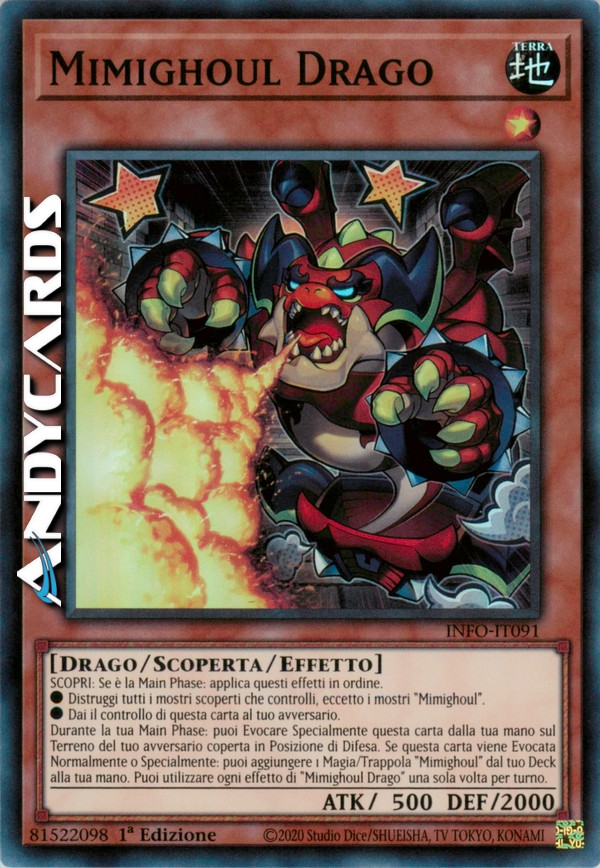 Durante la tua Main Phase: puoi Evocare Specialmente questa carta dalla tua mano sul Terreno del tuo avversario coperta in Posizione di Difesa. Se questa carta viene Evocata Normalmente o Specialmente: puoi aggiungere 1 Magia/Trappola "Mimighoul" dal tuo Deck alla tua mano. Puoi utilizzare ogni effetto di "Mimighoul Drago" una sola volta per turno.