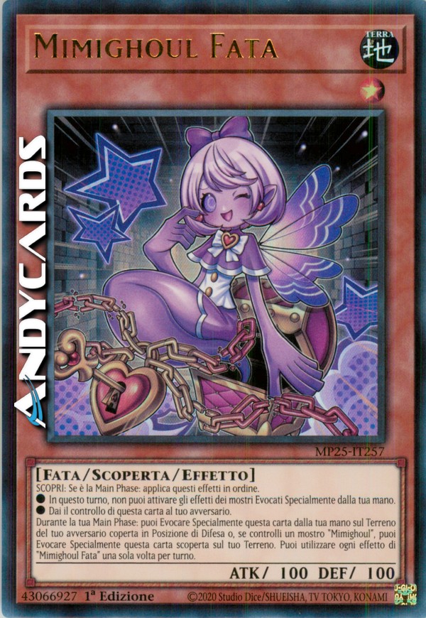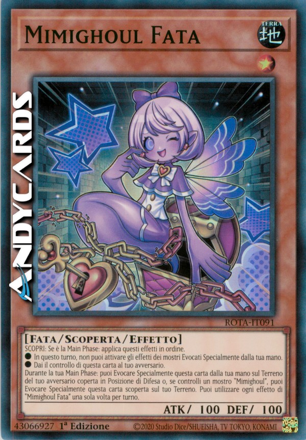 Durante la tua Main Phase: puoi Evocare Specialmente questa carta dalla tua mano sul Terreno del tuo avversario coperta in Posizione di Difesa o, se controlli un mostro "Mimighoul", puoi Evocare Specialmente questa carta scoperta sul tuo Terreno. Puoi utilizzare ogni effetto di "Mimighoul Fata" una sola volta per turno.