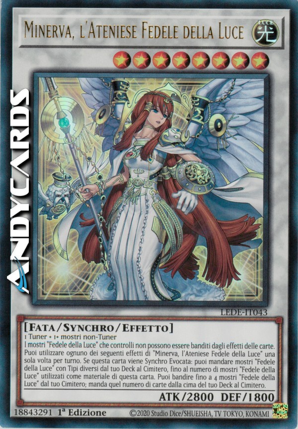 I mostri "Fedele della Luce" che controlli non possono essere banditi dagli effetti delle carte. Puoi utilizzare ognuno dei seguenti effetti di "Minerva, l'Ateniese Fedele della Luce" una sola volta per turno. Se questa carta viene Synchro Evocata: puoi mandare mostri "Fedele della Luce" con Tipi diversi dal tuo Deck al Cimitero, fino al numero di mostri "Fedele della Luce" utilizzati come materiale di questa carta. Puoi bandire fino a 4 mostri "Fedele della Luce" dal tuo Cimitero; manda quel numero di carte dalla cima del tuo Deck al Cimitero.