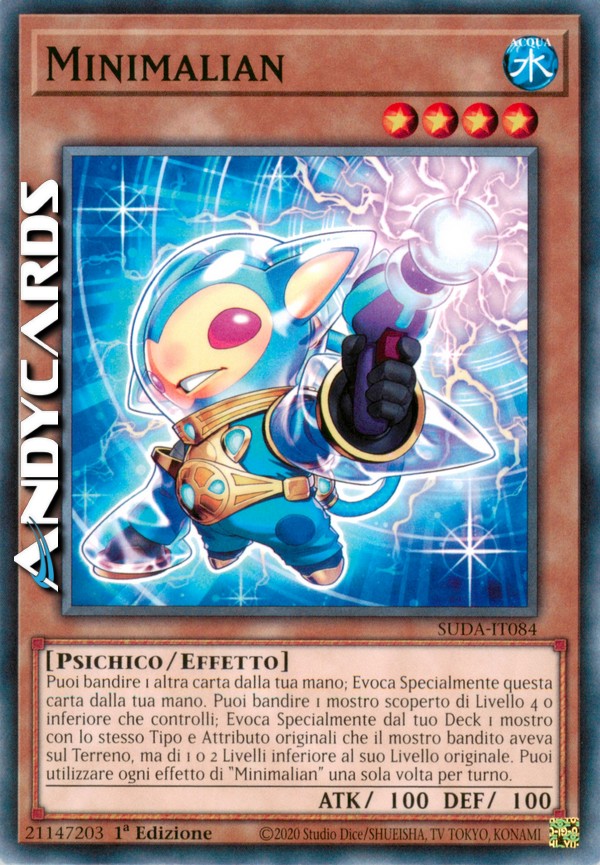 Puoi bandire 1 altra carta dalla tua mano; Evoca Specialmente questa carta dalla tua mano. Puoi bandire 1 mostro scoperto di Livello 4 o inferiore che controlli; Evoca Specialmente dal tuo Deck 1 mostro con lo stesso Tipo e Attributo originali che il mostro bandito aveva sul Terreno, ma di 1 o 2 Livelli inferiore al suo Livello originale. Puoi utilizzare ogni effetto di "Minimalian" una sola volta per turno.