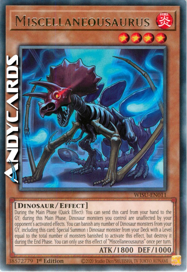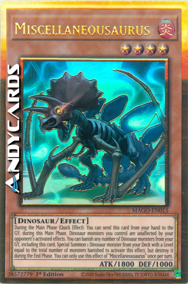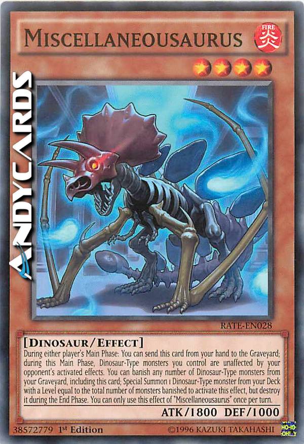 During the Main Phase (Quick Effect): You can send this card from your hand to the GY; during this Main Phase, Dinosaur monsters you control are unaffected by your opponent's activated effects. You can banish any number of Dinosaur monsters from your GY, including this card; Special Summon 1 Dinosaur monster from your Deck with a Level equal to the total number of monsters banished to activate this effect, but destroy it during the End Phase. You can only use this effect of "Miscellaneousaurus" once per turn.