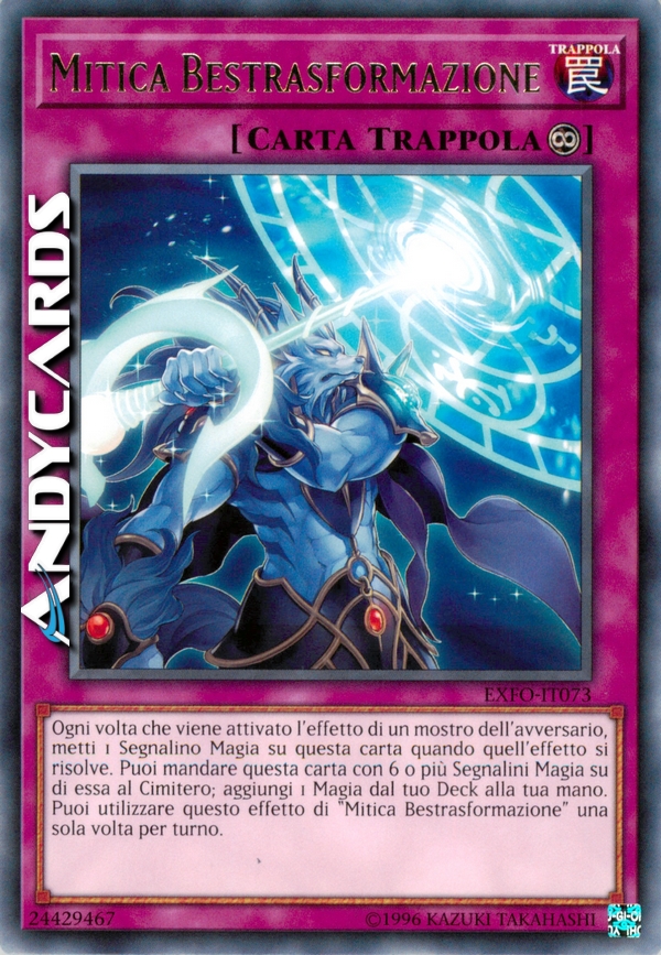 Ogni volta che viene attivato l'effetto di un mostro dell'avversario, metti 1 Segnalino Magia su questa carta quando quell'effetto si risolve. Puoi mandare questa carta con 6 o più Segnalini Magia su di essa al Cimitero; aggiungi 1 Magia dal tuo Deck alla tua mano. Puoi utilizzare questo effetto di "Mitica Bestrasformazione" una sola volta per turno.