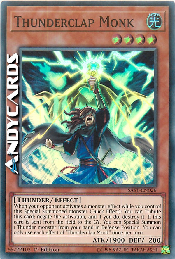 When your opponent activates a monster effect while you control this Special Summoned monster (Quick Effect): You can Tribute this card; negate the activation, and if you do, destroy it. If this card is sent from the field to the GY: You can Special Summon 1 Thunder monster from your hand in Defense Position. You can only use each effect of "Thunderclap Monk" once per turn.