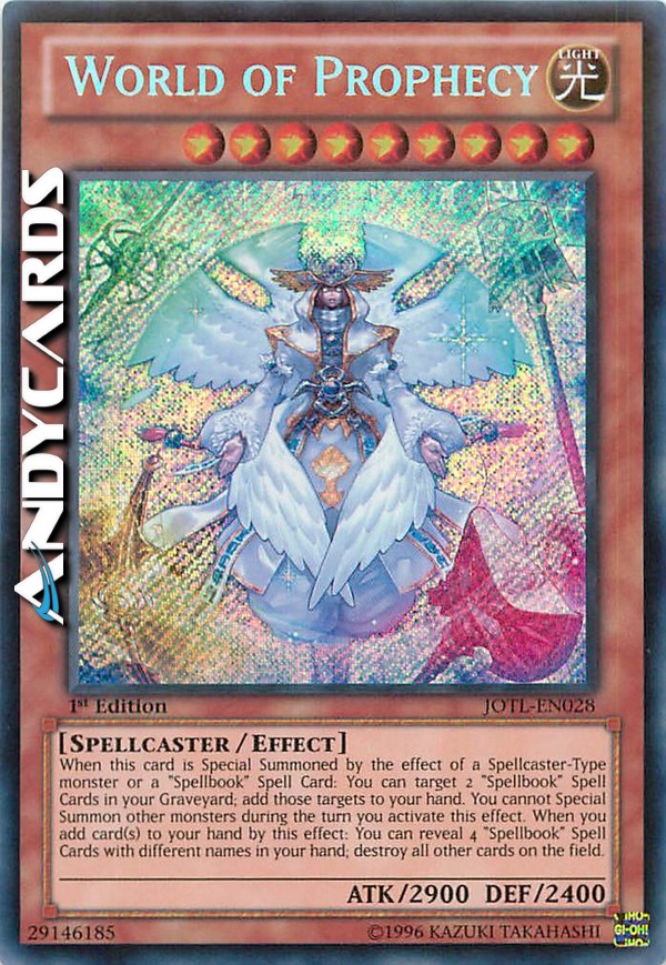 When this card is Special Summoned by the effect of a Spellcaster-Type monster or a "Spellbook" Spell Card: You can target 2 "Spellbook" Spell Cards in your Graveyard; add those targets to your hand. You cannot Special Summon other monsters during the turn you activate this effect. When you add card(s) to your hand by this effect: You can reveal 4 "Spellbook" Spell Cards with different names in your hand; destroy all other cards on the field.