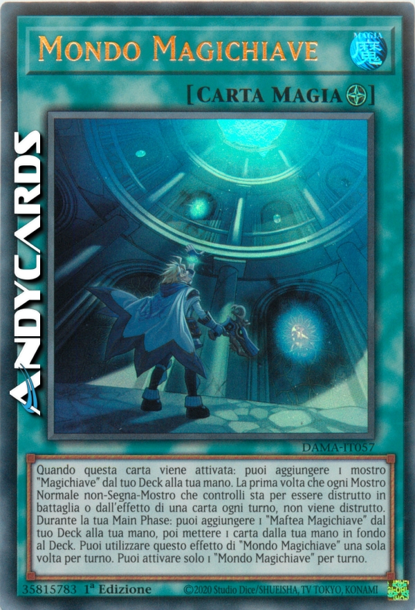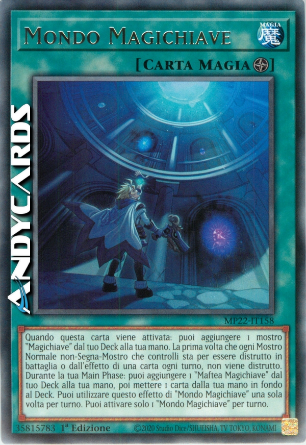 Quando questa carta viene attivata: puoi aggiungere 1 mostro "Magichiave" dal tuo Deck alla tua mano. La prima volta che ogni Mostro Normale non-Segna-Mostro che controlli sta per essere distrutto in battaglia o dall'effetto di una carta ogni turno, non viene distrutto. Durante la tua Main Phase: puoi aggiungere 1 "Maftea Magichiave" dal tuo Deck alla tua mano, poi mettere 1 carta dalla tua mano in fondo al Deck. Puoi utilizzare questo effetto di "Mondo Magichiave" una sola volta per turno. Puoi attivare solo 1 "Mondo Magichiave" per turno.