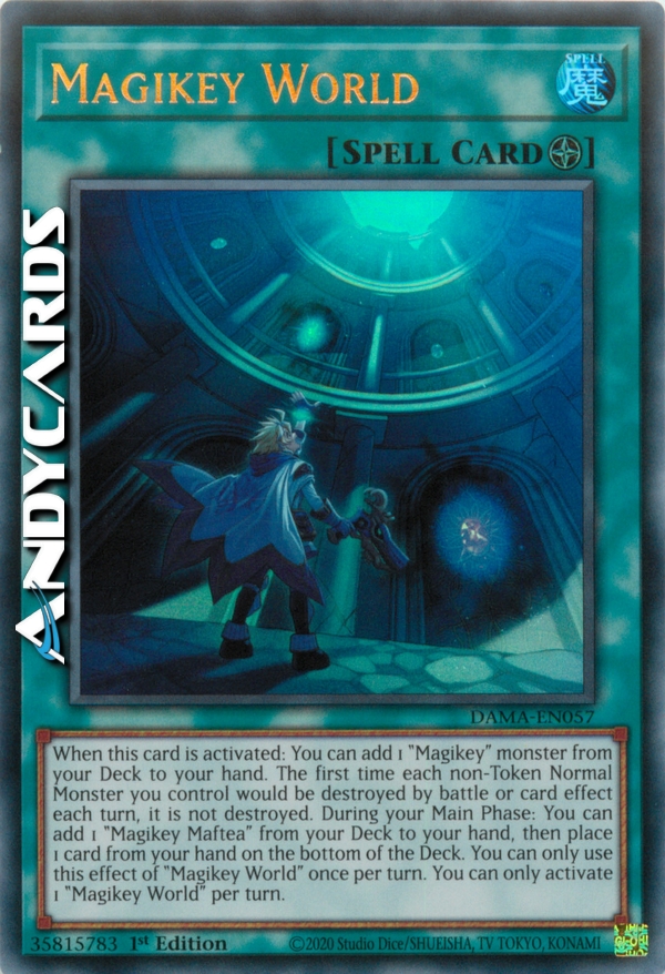 When this card is activated: You can add 1 "Magikey" monster from your Deck to your hand. The first time each non-Token Normal Monster you control would be destroyed by battle or card effect each turn, it is not destroyed. During your Main Phase: You can add 1 "Magikey Maftea" from your Deck to your hand, then place 1 card from your hand on the bottom of the Deck. You can only use this effect of "Magikey World" once per turn. You can only activate 1 "Magikey World" per turn.