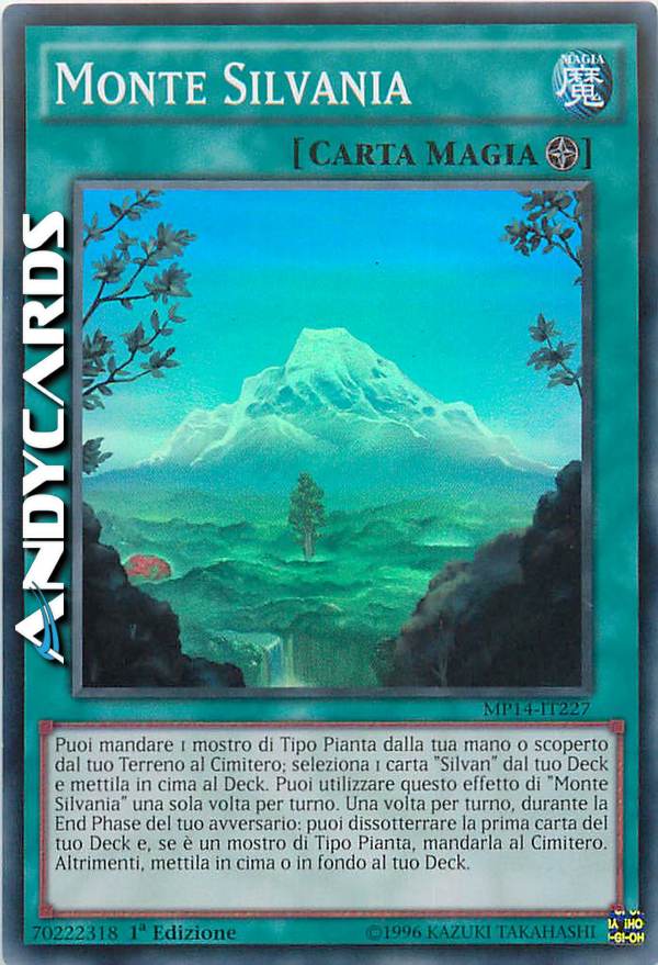 Puoi mandare 1 mostro di Tipo Pianta dalla tua mano o scoperto dal tuo Terreno al Cimitero; seleziona 1 carta "Silvan" dal tuo Deck e mettila in cima al Deck. Puoi utilizzare questo effetto di "Monte Silvania" una sola volta per turno. Una volta per turno, durante la End Phase del tuo avversario: puoi dissotterrare la prima carta del tuo Deck e, se è un mostro di Tipo Pianta, mandarla al Cimitero. Altrimenti, mettila in cima o in fondo al tuo Deck.