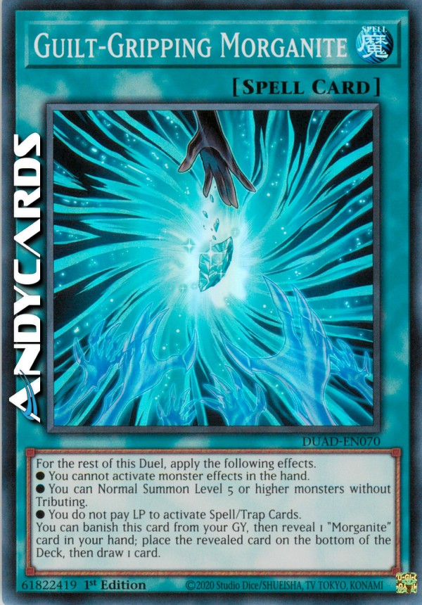Puoi bandire questa carta dal tuo Cimitero, poi rivelare 1 carta "Morganite" nella tua mano; metti la carta rivelata in fondo al Deck, poi pesca 1 carta.