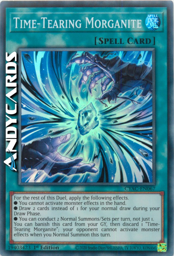 Puoi bandire questa carta dal tuo Cimitero, poi scartare 1 "Morganite Strappa-Tempo"; il tuo avversario non può attivare effetti di mostri quando Evochi Normalmente in questo turno.
