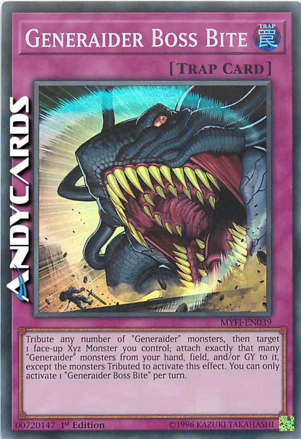 Offri come Tributo un qualsiasi numero di mostri "Generaider", poi scegli come bersaglio 1 Mostro Xyz scoperto che controlli; attacca esattamente quel numero di mostri "Generaider" dalla tua mano, Terreno e/o Cimitero a esso, eccetto i mostri offerti come Tributo per attivare questo effetto. Puoi attivare solo 1 "Morso Boss Generaider" per turno.