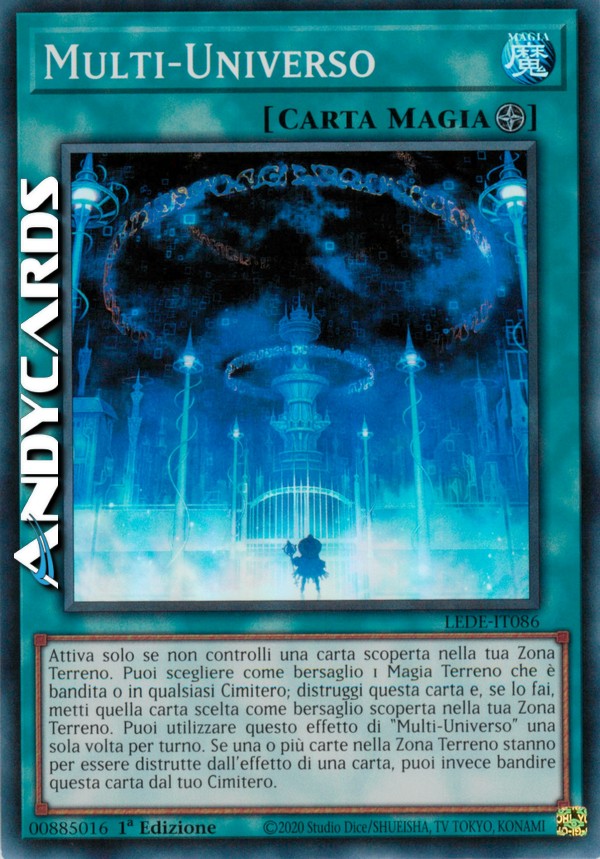 Attiva solo se non controlli una carta scoperta nella tua Zona Terreno. Puoi scegliere come bersaglio 1 Magia Terreno che è bandita o in qualsiasi Cimitero; distruggi questa carta e, se lo fai, metti quella carta scelta come bersaglio scoperta nella tua Zona Terreno. Puoi utilizzare questo effetto di "Multi-Universo" una sola volta per turno. Se una o più carte nella Zona Terreno stanno per essere distrutte dall'effetto di una carta, puoi invece bandire questa carta dal tuo Cimitero.