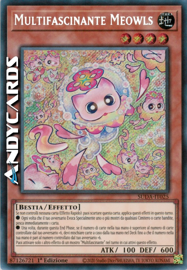 Se non controlli nessuna carta (Effetto Rapido): puoi scartare questa carta; applica questi effetti in questo turno. ●Ogni volta che il tuo avversario Evoca Specialmente uno o più mostri da qualsiasi Cimitero o carte bandite, pesca immediatamente 1 carta. ●Una volta, durante questa End Phase, se il numero di carte nella tua mano è superiore al numero di carte controllate dal tuo avversario +6, devi mischiare carte a caso dalla tua mano nel Deck fino a che il numero nella tua mano è pari al numero controllato dal tuo avversario +6. Puoi attivare solo 1 altro effetto di un mostro "Multifascinante" nel turno in cui attivi questo effetto.
