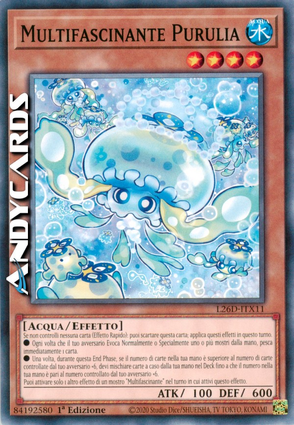 Se non controlli nessuna carta (Effetto Rapido): puoi scartare questa carta; applica questi effetti in questo turno. ●Ogni volta che il tuo avversario Evoca Normalmente o Specialmente uno o più mostri dalla mano, pesca immediatamente 1 carta. ●Una volta, durante questa End Phase, se il numero di carte nella tua mano è superiore al numero di carte controllate dal tuo avversario +6, devi mischiare carte a caso dalla tua mano nel Deck fino a che il numero nella tua mano è pari al numero controllato dal tuo avversario +6. Puoi attivare solo 1 altro effetto di un mostro "Multifascinante" nel turno in cui attivi questo effetto.