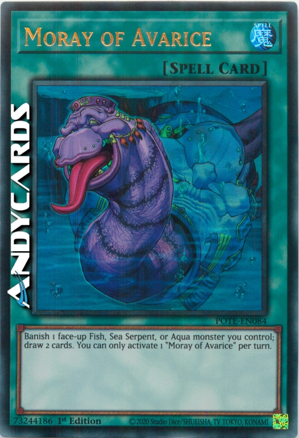 Banish 1 face-up Fish, Sea Serpent, or Aqua monster you control; draw 2 cards. You can only activate 1 "Moray of Avarice" per turn.