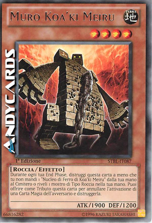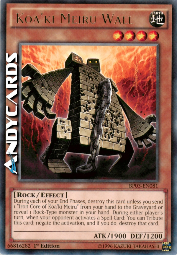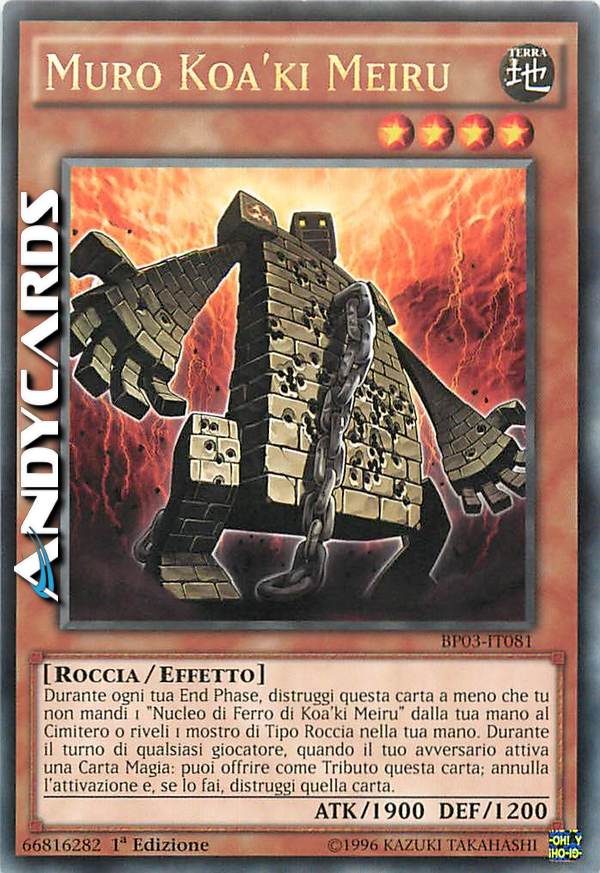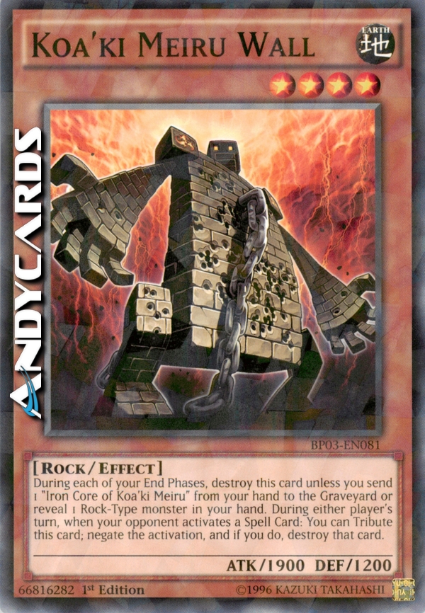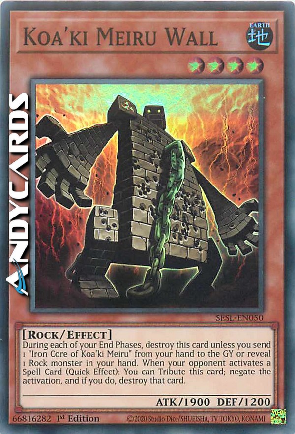Durante ogni tua End Phase, distruggi questa carta a meno che tu non mandi 1 "Nucleo di Ferro di Koa'ki Meiru" dalla tua mano al Cimitero o riveli 1 mostro di Tipo Roccia nella tua mano. Puoi offrire come Tributo questa carta per annullare l'attivazione di una Carta Magia dell'avversario e distruggerla.