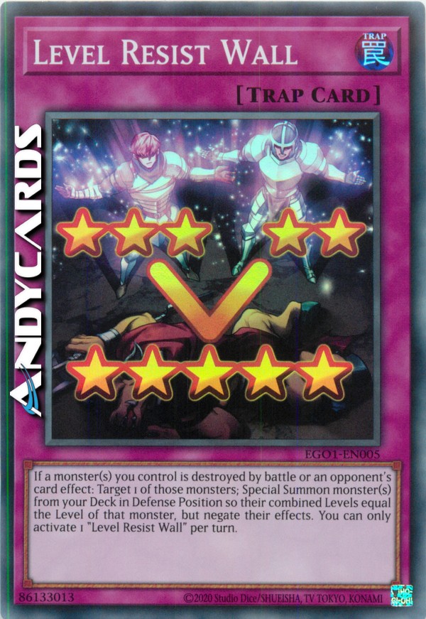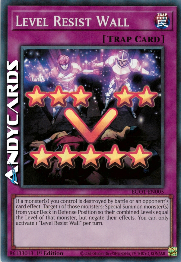 Se uno o più mostri che controlli vengono distrutti in battaglia o dall'effetto di una carta dell'avversario: scegli come bersaglio 1 di quei mostri; Evoca Specialmente mostri dal tuo Deck in Posizione di Difesa in modo che la somma dei loro Livelli sia pari al Livello di quel mostro, ma annulla i loro effetti. Puoi attivare solo 1 "Muro Resisti Livello" per turno.