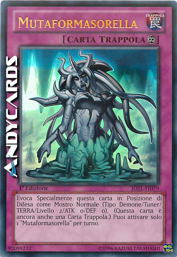 Evoca Specialmente questa carta in Posizione di Difesa come Mostro Normale (Tipo Demone/Tuner/TERRA/Livello 2/ATK 0/DEF 0). (Questa carta è ancora anche una Carta Trappola.) Puoi attivare solo 1 "Muraformasorella" per turno.