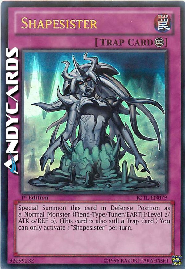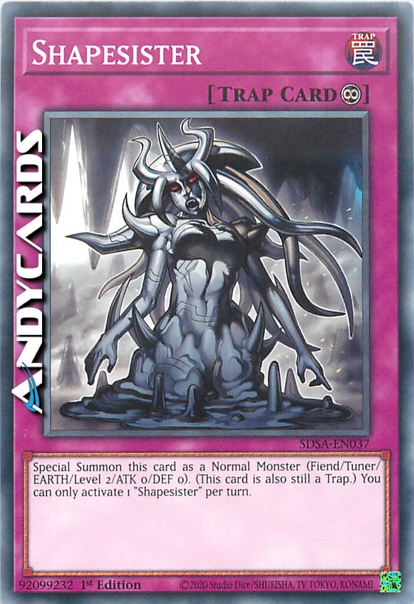 Special Summon this card in Defense Position as a Normal Monster (Fiend-Type/Tuner/EARTH/Level 2/ATK 0/DEF 0). (This card is also still a Trap Card.) You can only activate 1 "Shapesister" per turn.