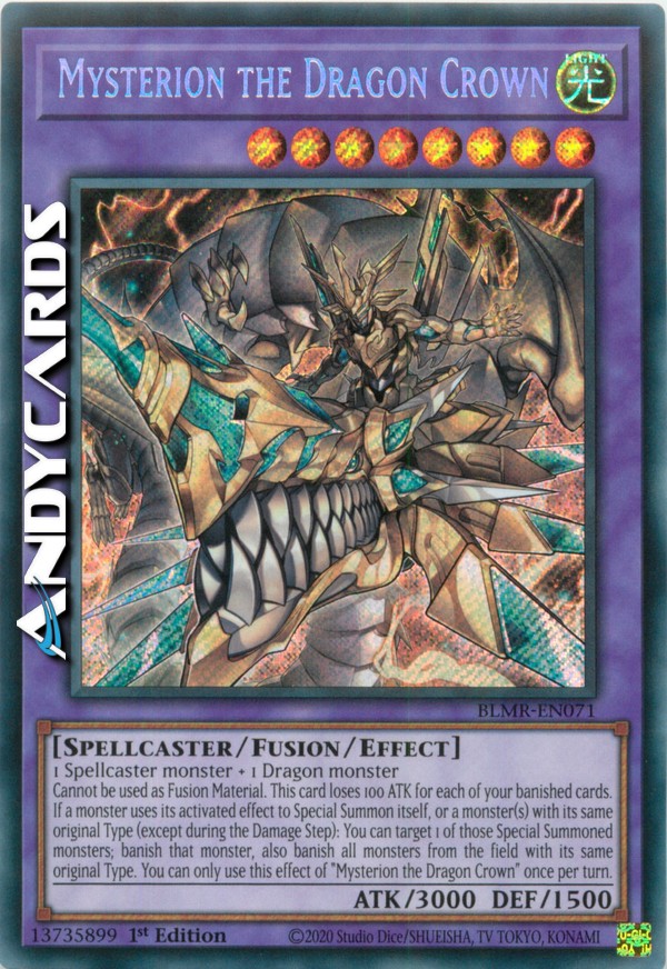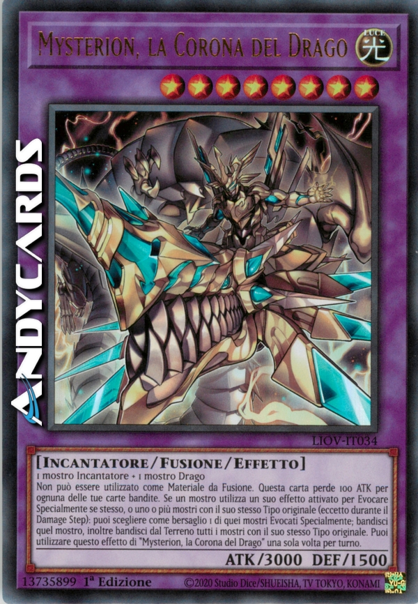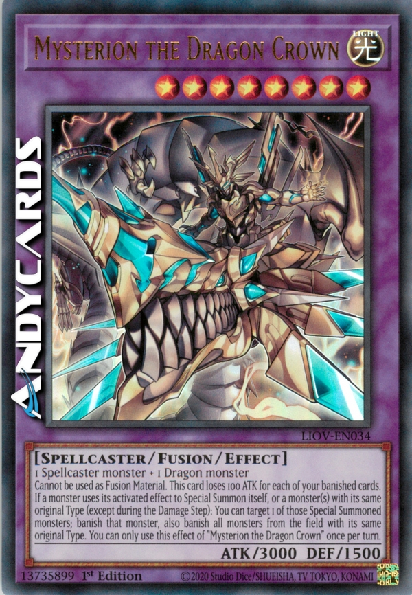 Non può essere utilizzato come Materiale da Fusione. Perde 100 ATK per ognuna delle tue carte bandite. Se un mostro utilizza un suo effetto attivato per Evocare Specialmente se stesso, o uno o più mostri con il suo stesso Tipo originale (eccetto durante il Damage Step): puoi scegliere come bersaglio 1 di quei mostri Evocati Specialmente; bandisci quel mostro, inoltre bandisci dal Terreno tutti i mostri con il suo stesso Tipo originale. Puoi utilizzare questo effetto di "Mysterion, la Corona del Drago" una sola volta per turno.