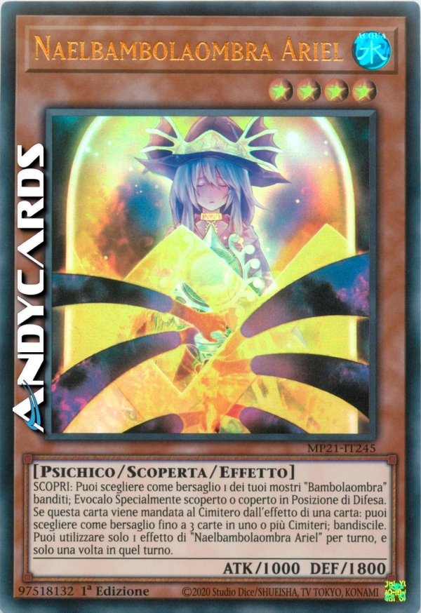 Se questa carta viene mandata al Cimitero dall'effetto di una carta: puoi scegliere come bersaglio fino a 3 carte in uno o più Cimiteri; bandiscile. Puoi utilizzare solo 1 effetto di "Naelbambolaombra Ariel" per turno, e solo una volta in quel turno.