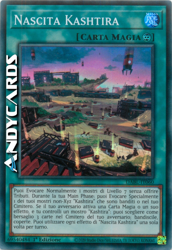 Puoi Evocare Normalmente i mostri di Livello 7 senza offrire Tributi. Durante la tua Main Phase: puoi Evocare Specialmente 1 dei tuoi mostri non-Xyz "Kashtira" che sono banditi o nel tuo Cimitero. Se il tuo avversario attiva una Carta Magia o un suo effetto, e tu controlli un mostro "Kashtira": puoi scegliere come bersaglio 3 carte nel Cimitero del tuo avversario; bandiscile, coperte. Puoi utilizzare ogni effetto di "Nascita Kashtira" una sola volta per turno.