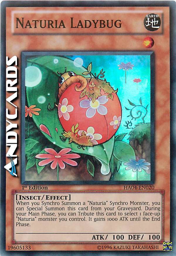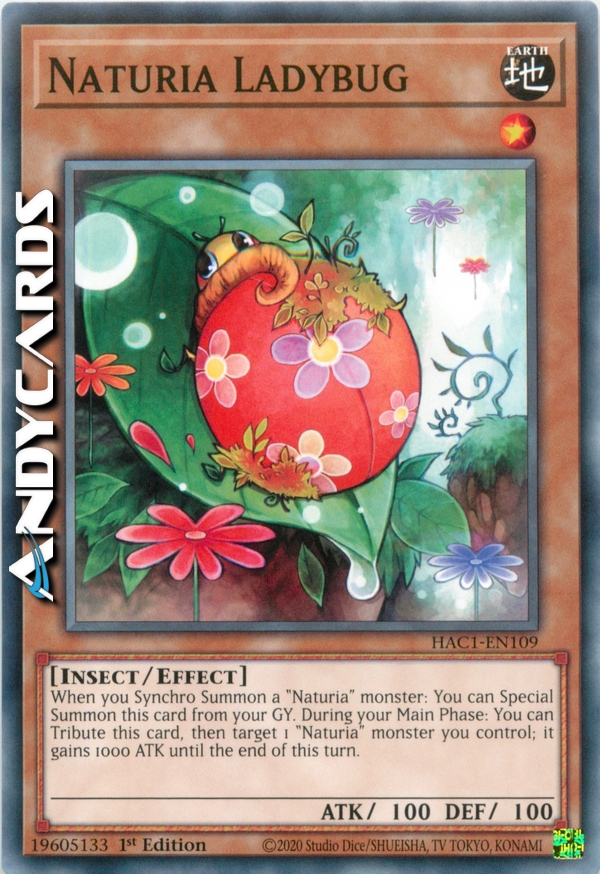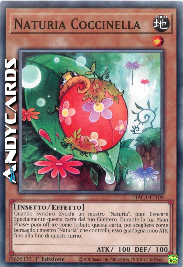 Quando Synchro Evochi un Mostro Synchro "Naturia", puoi Evocare Specialmente questa carta dal tuo Cimitero. Durante la tua Main Phase, puoi offrire come Tributo questa carta per scegliere 1 mostro "Naturia" scoperto che controlli. Esso guadagna 1000 ATK fino alla End Phase.