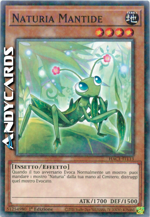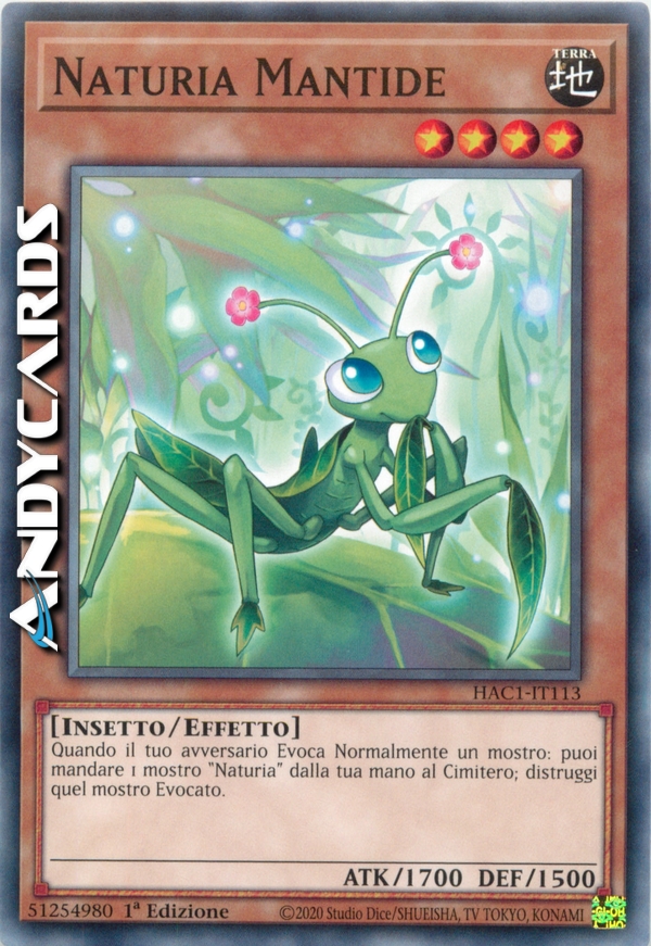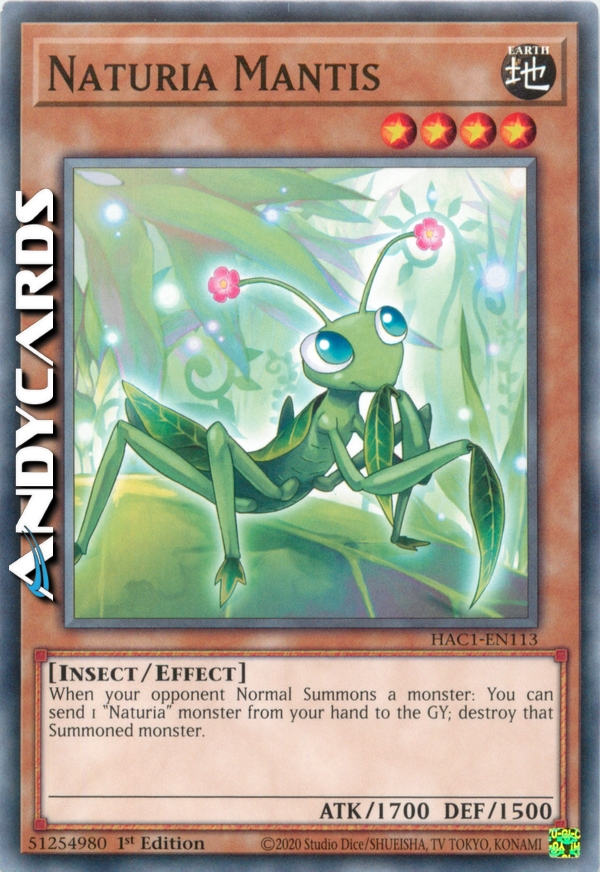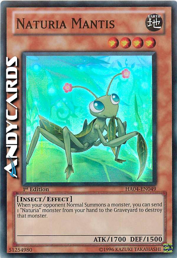 Quando il tuo avversario Evoca Normalmente un mostro, puoi mandare 1 mostro "Naturia" dalla tua mano al Cimitero per distruggere quel mostro.
