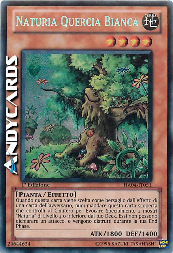 Quando questa carta viene scelta come bersaglio dall'effetto di una carta dell'avversario, puoi mandare questa carta scoperta che controlli al Cimitero per Evocare Specialmente 2 mostri "Naturia" di Livello 4 o inferiore dal tuo Deck. Essi non possono dichiarare un attacco, e vengono distrutti durante la tua End Phase.