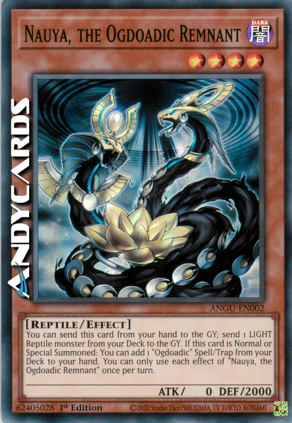 You can send this card from your hand to the GY; send 1 LIGHT Reptile monster from your Deck to the GY. If this card is Normal or Special Summoned: You can add 1 "Ogdoadic" Spell/Trap from your Deck to your hand. You can only use each effect of "Nauya, the Ogdoadic Remnant" once per turn.