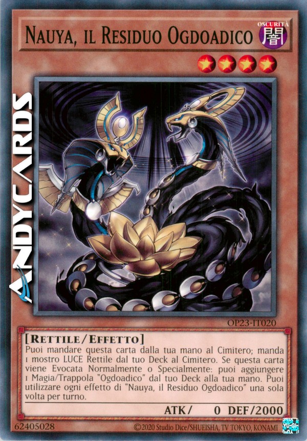 Puoi mandare questa carta dalla tua mano al Cimitero; manda 1 mostro LUCE Rettile dal tuo Deck al Cimitero. Se questa carta viene Evocata Normalmente o Specialmente: puoi aggiungere 1 Magia/Trappola "Ogdoadico" dal tuo Deck alla tua mano. Puoi utilizzare ogni effetto di "Nauya, il Residuo Ogdoadico" una sola volta per turno.