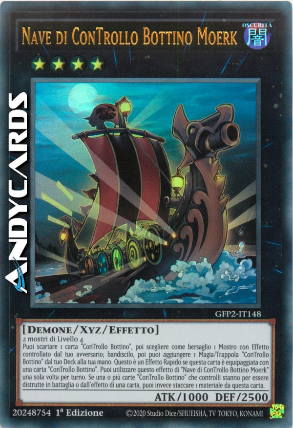 Puoi scartare 1 carta "ConTrollo Bottino", poi scegliere come bersaglio 1 Mostro con Effetto controllato dal tuo avversario; bandiscilo, poi puoi aggiungere 1 Magia/Trappola "ConTrollo Bottino" dal tuo Deck alla tua mano. Questo è un Effetto Rapido se questa carta è equipaggiata con una carta "ConTrollo Bottino". Puoi utilizzare questo effetto di "Nave di ConTrollo Bottino Moerk" una sola volta per turno. Se una o più carte "ConTrollo Bottino" che controlli stanno per essere distrutte in battaglia o dall'effetto di una carta, puoi invece staccare 1 materiale da questa carta.