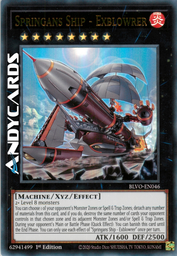 You can choose 1 of your opponent's Monster Zones or Spell & Trap Zones; detach any number of materials from this card, and if you do, destroy the same number of cards your opponent controls in that chosen zone and its adjacent Monster Zones and/or Spell & Trap Zones. During your opponent's Main or Battle Phase (Quick Effect): You can banish this card until the End Phase. You can only use each effect of "Springans Ship - Exblowrer" once per turn.