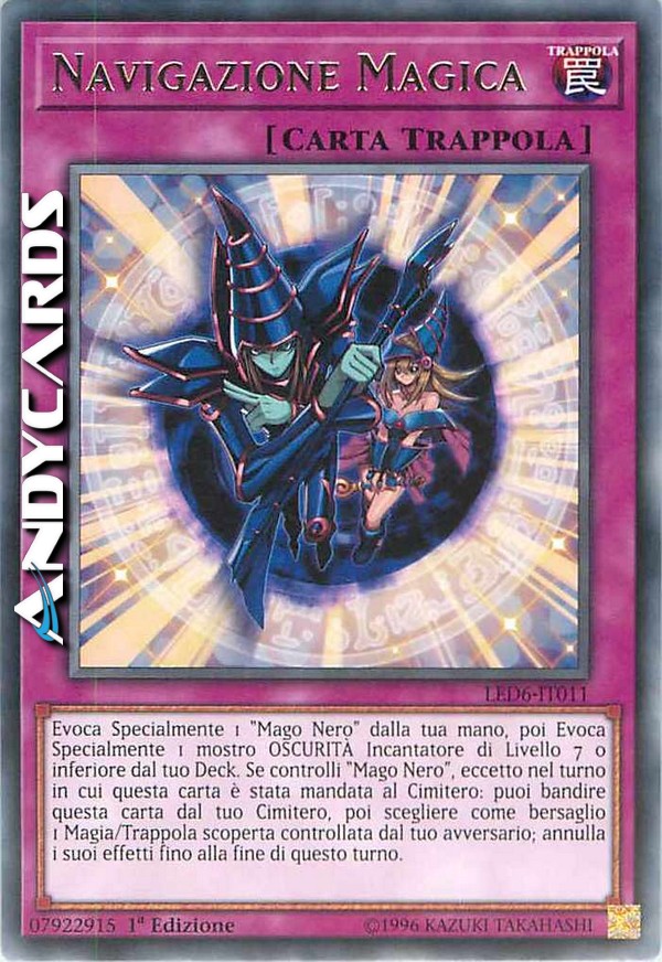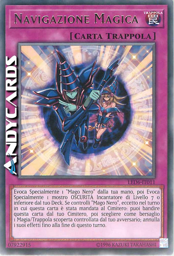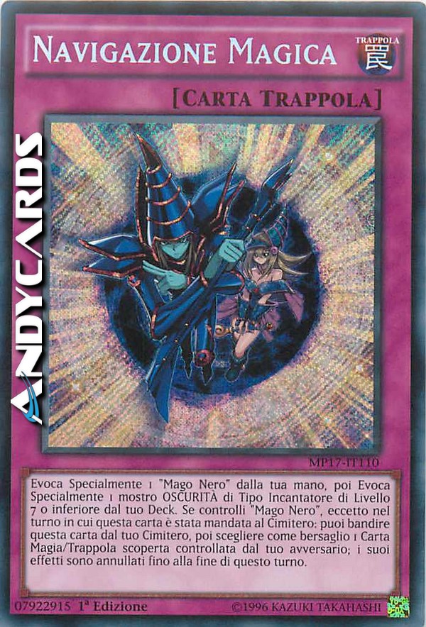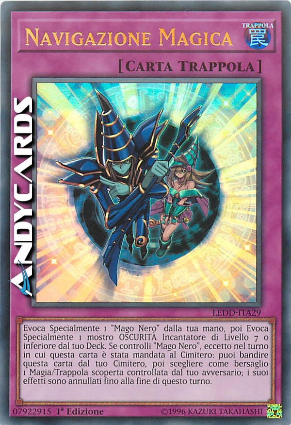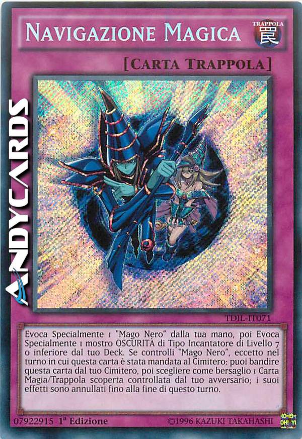 Evoca Specialmente 1 "Mago Nero" dalla tua mano, poi Evoca Specialmente 1 mostro OSCURITÀ Incantatore di Livello 7 o inferiore dal tuo Deck. Se controlli "Mago Nero", eccetto nel turno in cui questa carta è stata mandata al Cimitero: puoi bandire questa carta dal tuo Cimitero, poi scegliere come bersaglio 1 Magia/Trappola scoperta controllata dal tuo avversario; annulla i suoi effetti fino alla fine di questo turno.
