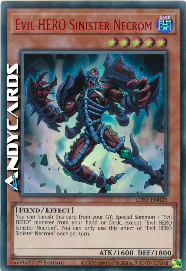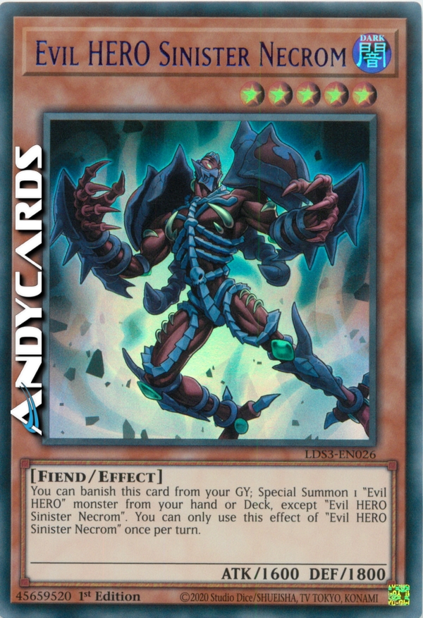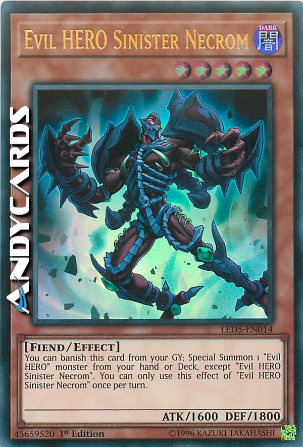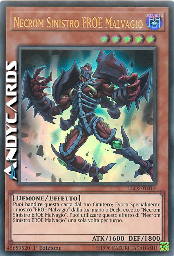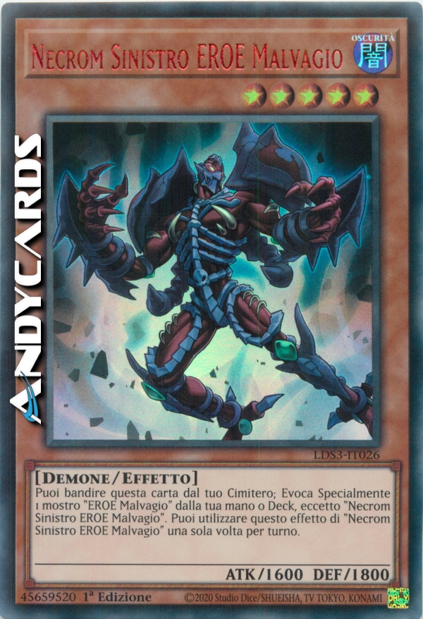 Puoi bandire questa carta dal tuo Cimitero; Evoca Specialmente 1 mostro "EROE Malvagio" dalla tua mano o Deck, eccetto "Necrom Sinistro EROE Malvagio". Puoi utilizzare questo effetto di "Necrom Sinistro EROE Malvagio" una sola volta per turno.