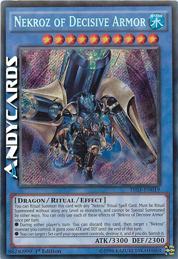 You can Ritual Summon this card with any "Nekroz" Ritual Spell Card. Must be Ritual Summoned without using any Level 10 monsters, and cannot be Special Summoned by other ways. You can only use each of these effects of "Nekroz of Decisive Armor" once per turn.