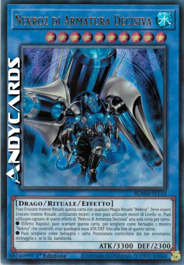 Puoi Evocare tramite Rituale questa carta con qualsiasi Carta Magia Rituale "Nekroz". Deve essere Evocato tramite Rituale senza utilizzare nessun mostro di Livello 10, e non può essere Evocato Specialmente in altri modi. Puoi utilizzare ognuno di questi effetti di "Nekroz di Armatura Decisiva" una sola volta per turno.