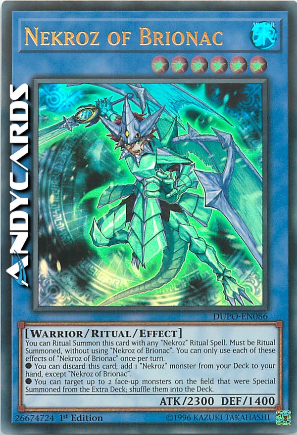 You can Ritual Summon this card with any "Nekroz" Ritual Spell. Must be Ritual Summoned, without using "Nekroz of Brionac". You can only use each of these effects of "Nekroz of Brionac" once per turn.