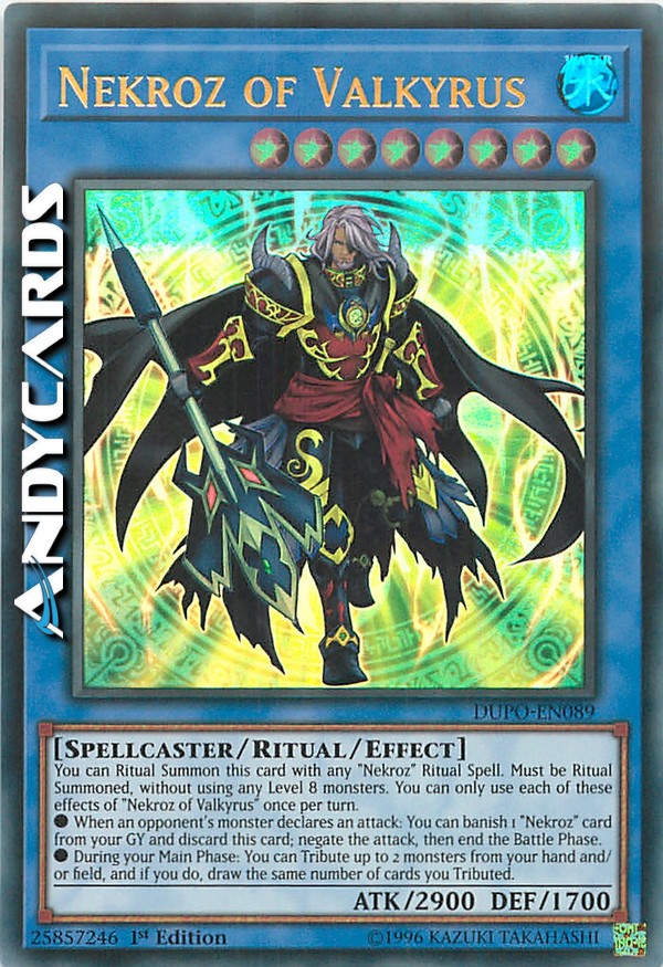 You can Ritual Summon this card with any "Nekroz" Ritual Spell. Must be Ritual Summoned, without using any Level 8 monsters. You can only use each of these effects of "Nekroz of Valkyrus" once per turn.